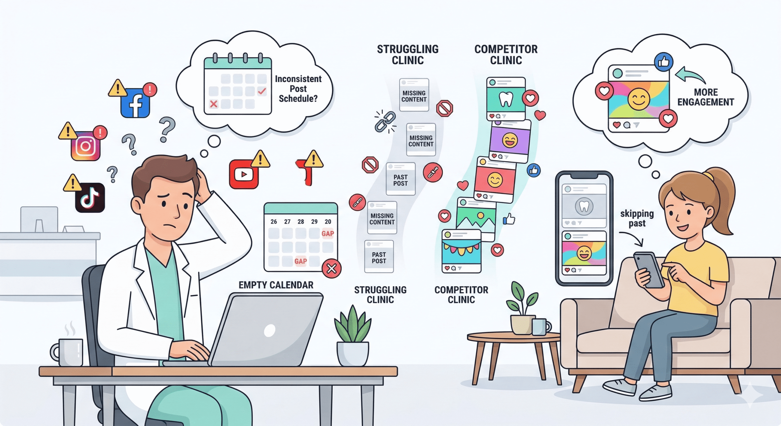 Without regular blog posts, educational content, or social media updates, clinics struggle to build trust and authority online, making it harder for patients to discover them.